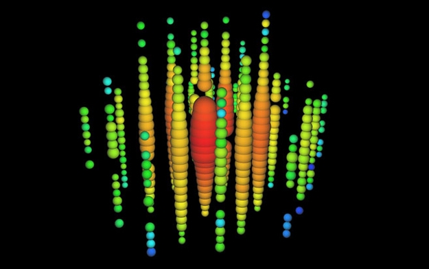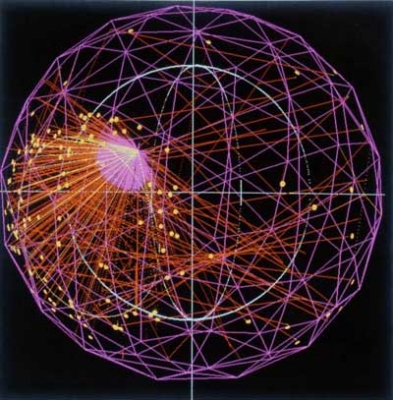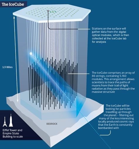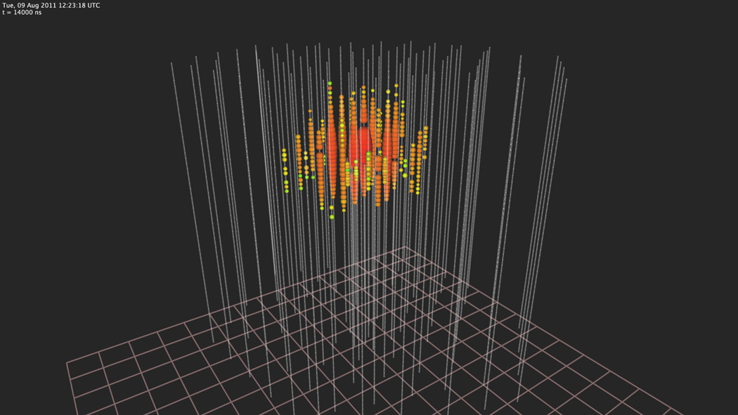 Computer data shows a neutrino impact amid IceCube's hollow columns.