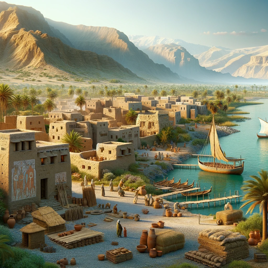 Rendered in ChatGPT - A photorealistic scene from the Gulf of Gabes and the Atlas Basin in Tunisia, during the period 3000 to 1600 BC. It captures the essence of ancient life and environment in this historical setting with remarkable detail.