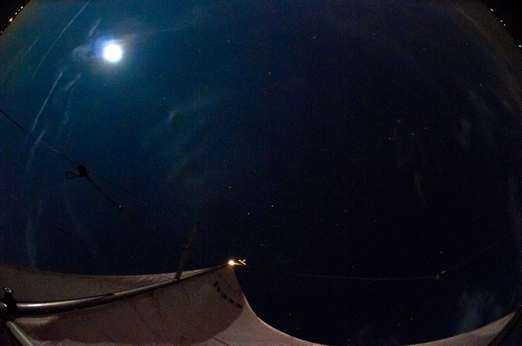 The heat of the day still radiates off her roof. We wait, and listen until the sun is gone. Greg jabs his finger into Izzy's ribs to see if he can get him to make a peep, but we all remain silent, transfixed by the fabric blowing in the wind. All nine yards.